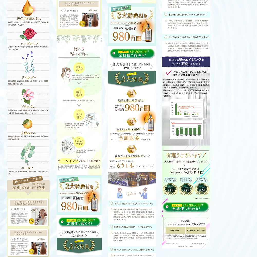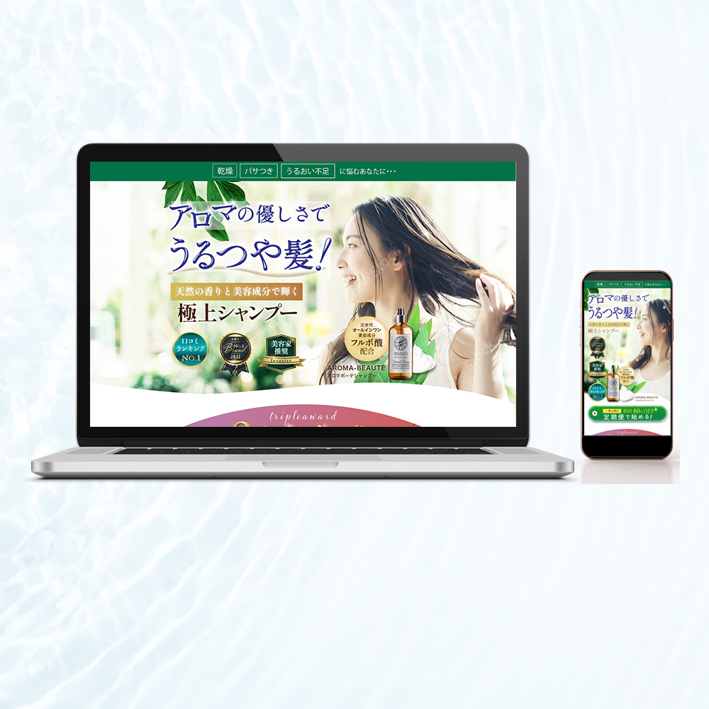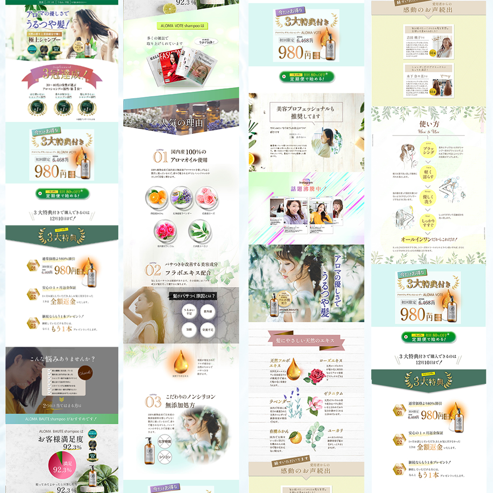 架空のアロマシャンプーのランディングページを作成しました。髪のパサつきに悩む30〜40代の女性をターゲットに、髪の悩みから解放され、うるつやな髪が目指せるシャンプーをアピールしました。無添加へのこだわりとアロマ効果のある香りというところをフォーカスして、自然派の女性にも響くような優しい雰囲気を意識しました。ランディングページに必要な要素は押さえつつ押し売り感をなるべく出さない配慮をしております。